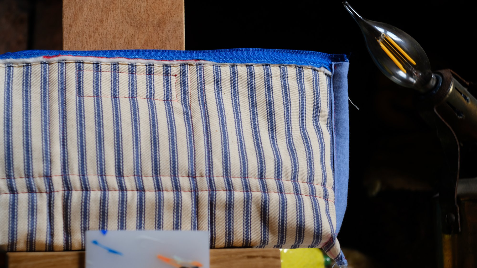 One of a kind quilted pencil case, lined with vintage ticking stripe upholstery fabric & nylon zipper. Inspired by medieval chequy