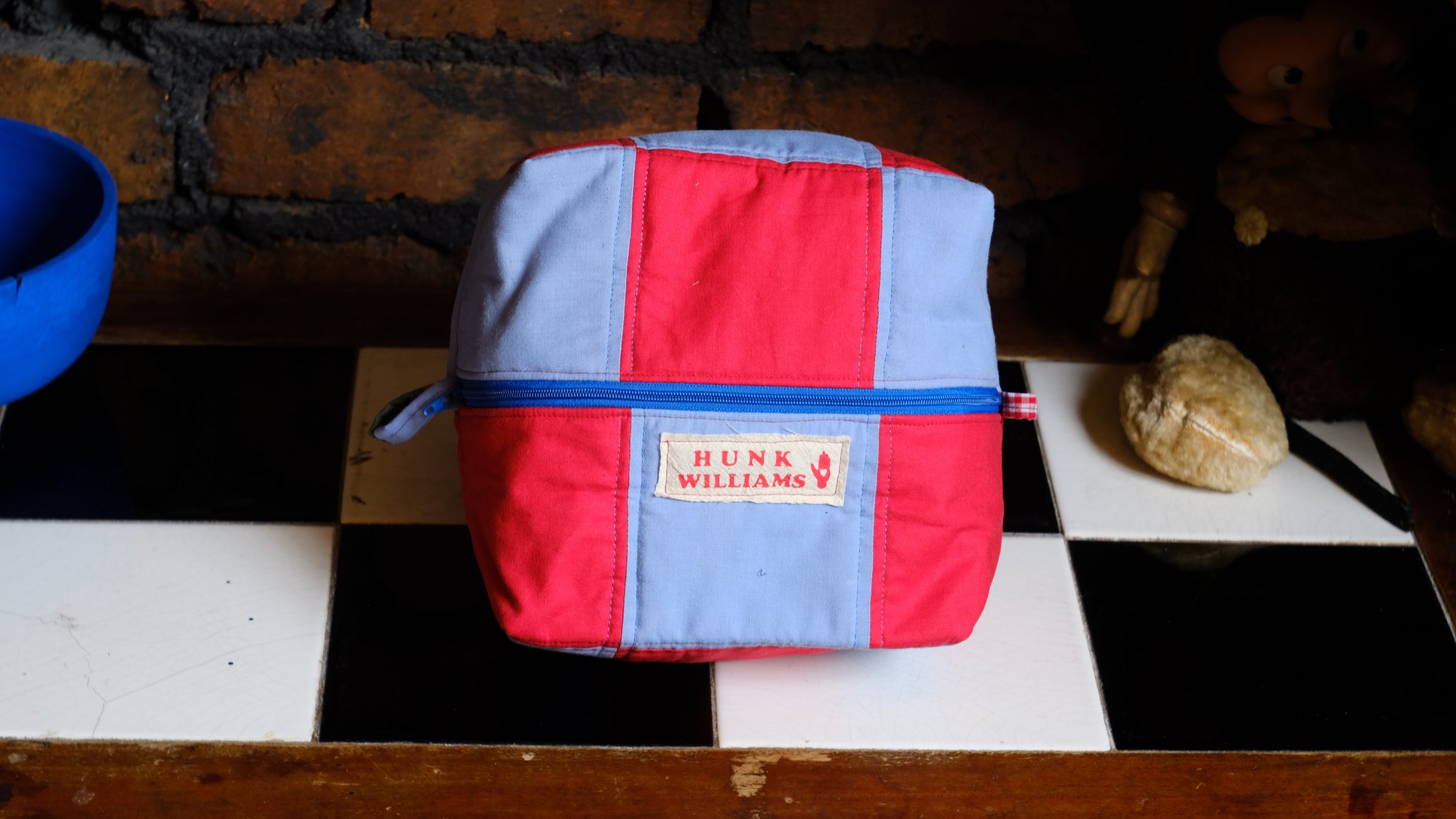 One of a kind large quilted travel bag with two pull tabs & nylon zipper, lined with reclaimed gingham fabric. Inspired by medieval chequy