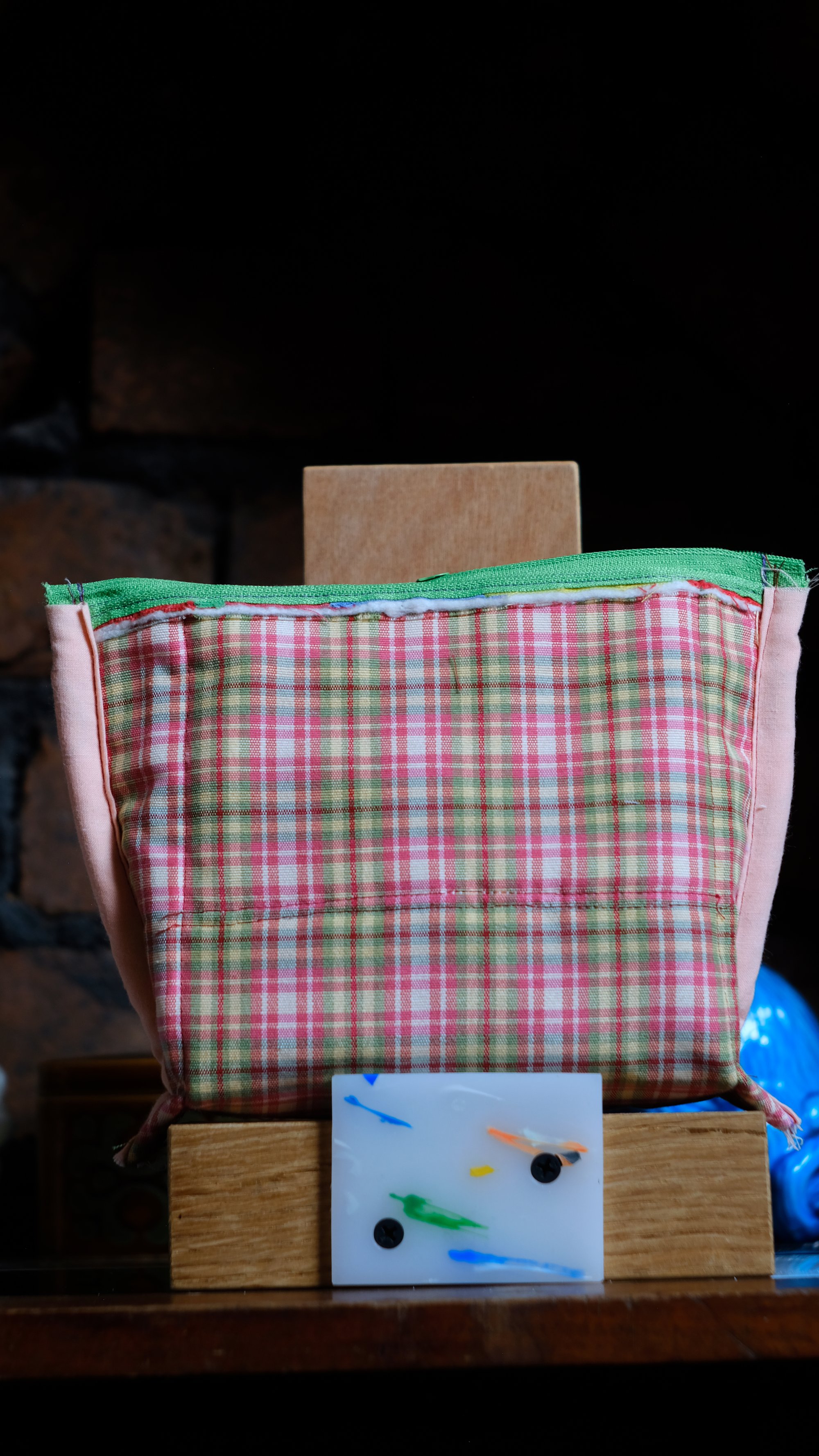 One of a kind quilted pouch, lined with vintage gingham fabric & nylon zipper